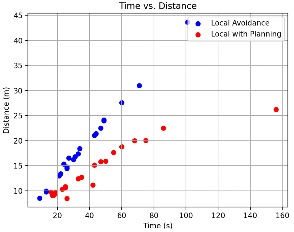 Surprisingly, the local-only method outperformed the combined planning approach. We believe this is primarily due to map inaccuracies caused by PyBullet camera intrinsics, which made it difficult to construct a perfectly accurate local map. These inaccuracies occasionally caused collisions despite planned paths.