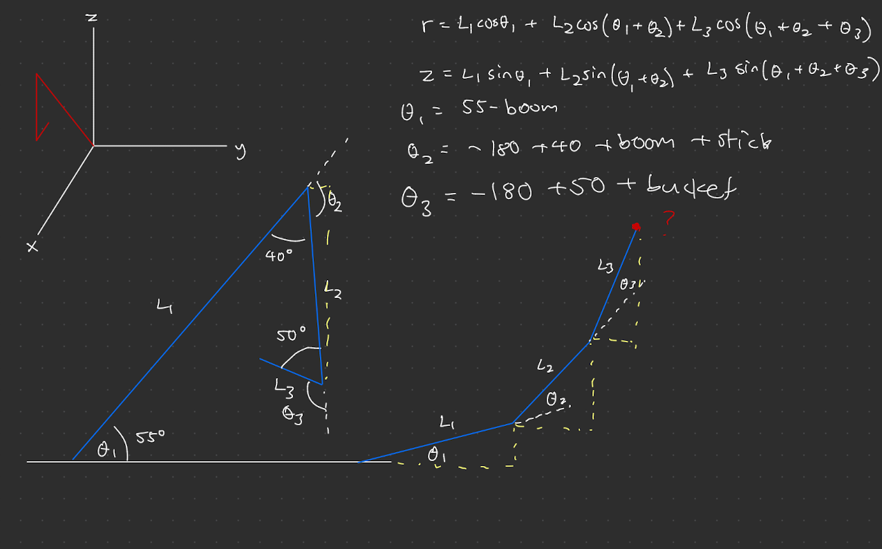 Forward kinematics equations used to compute joint positions and excavator bucket tip location
